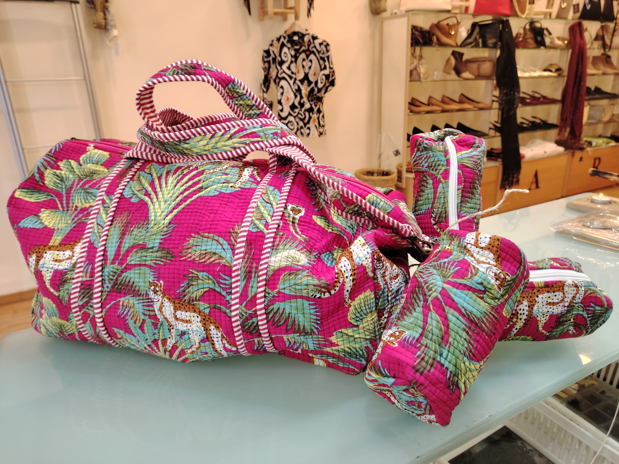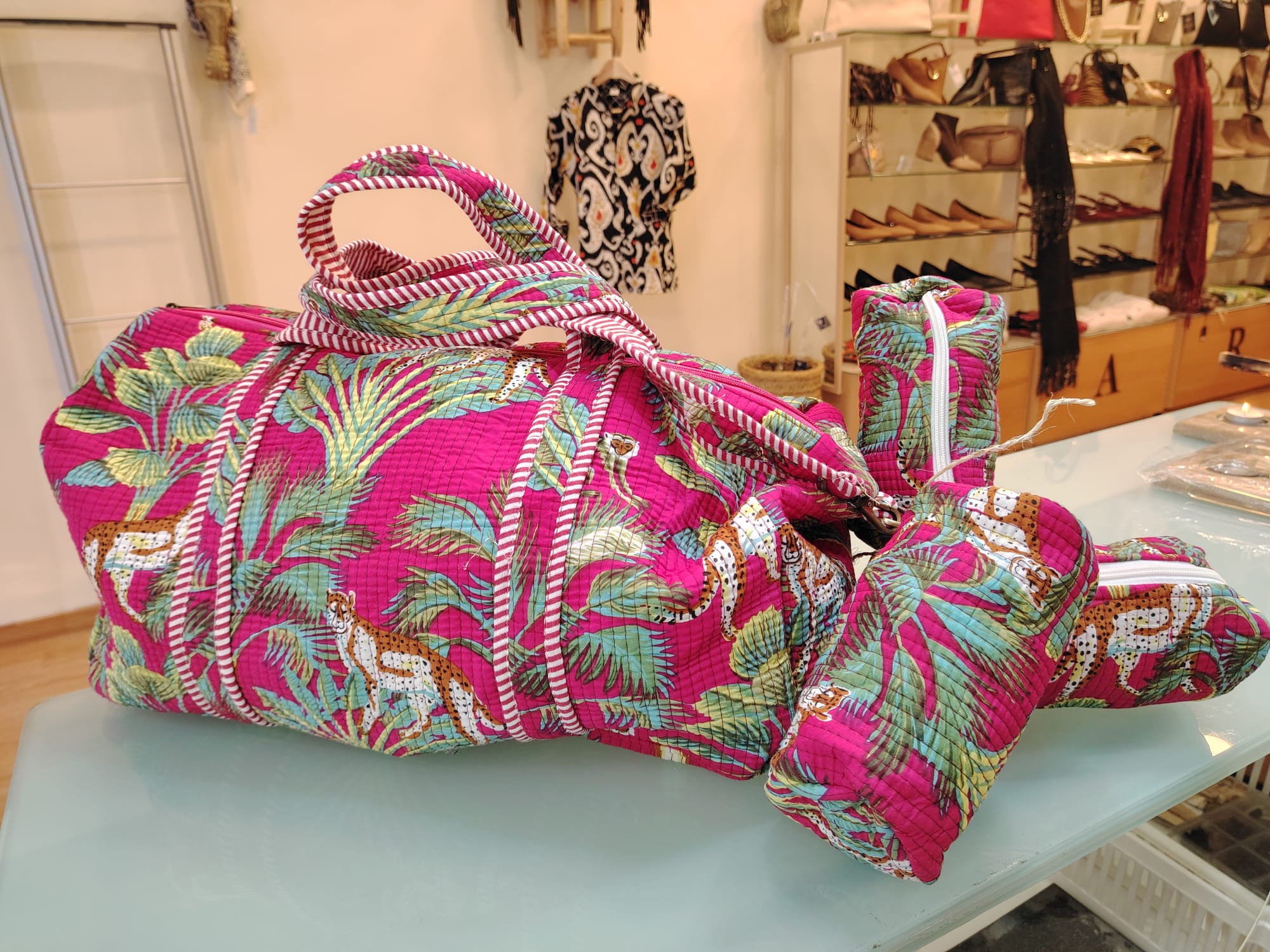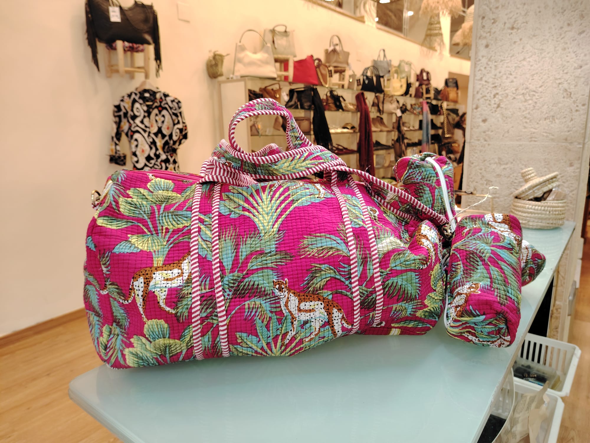 Cada bolso ha sido confeccionado utilizando técnicas textiles tradicionales de la India. Su estampado exótico de leopardos y palmeras sobre fondo fucsia captura la energía y la belleza del sudeste asiático, haciendo que tu equipaje sea imposible de ignorar (y muy fácil de localizar).