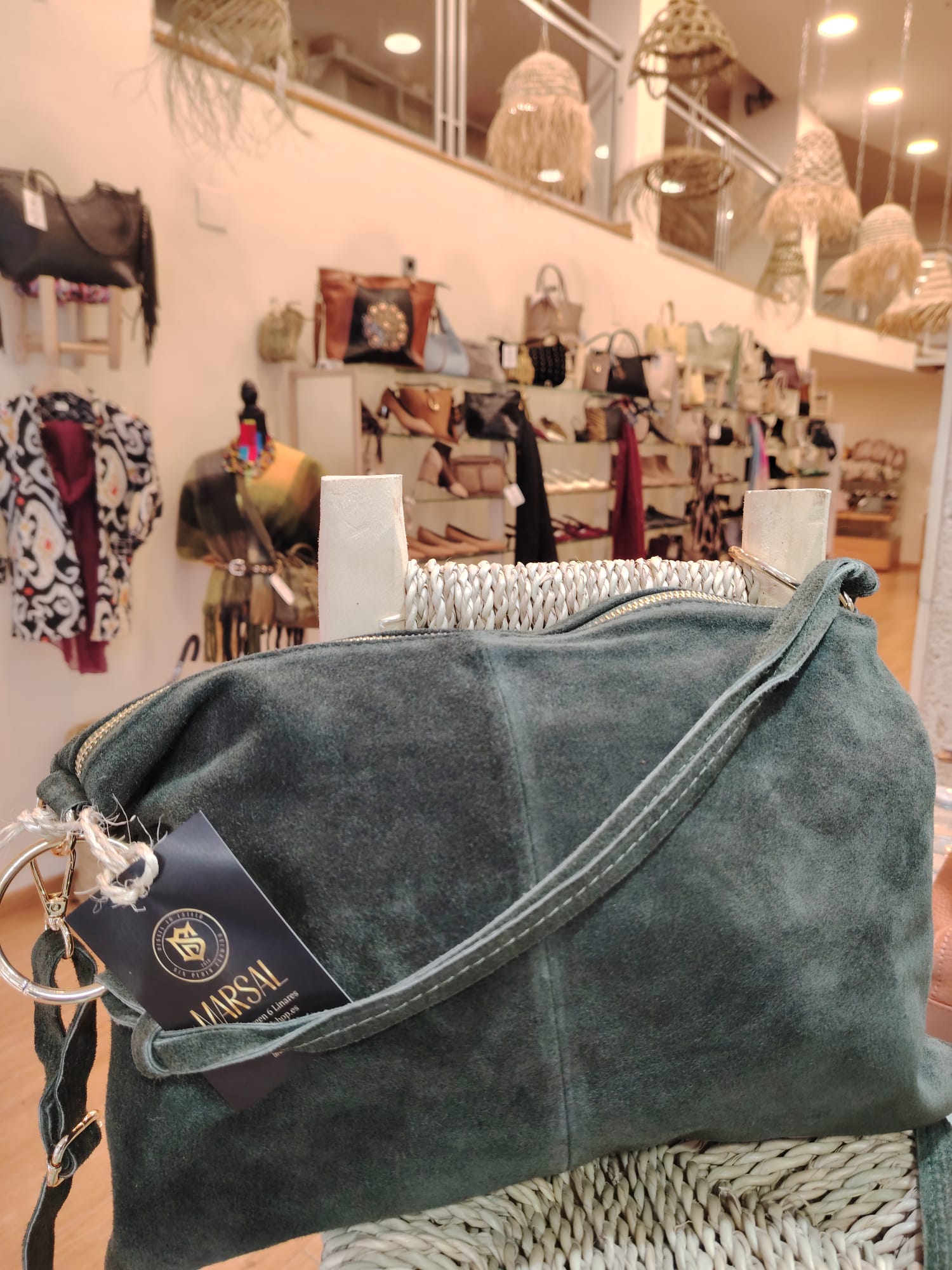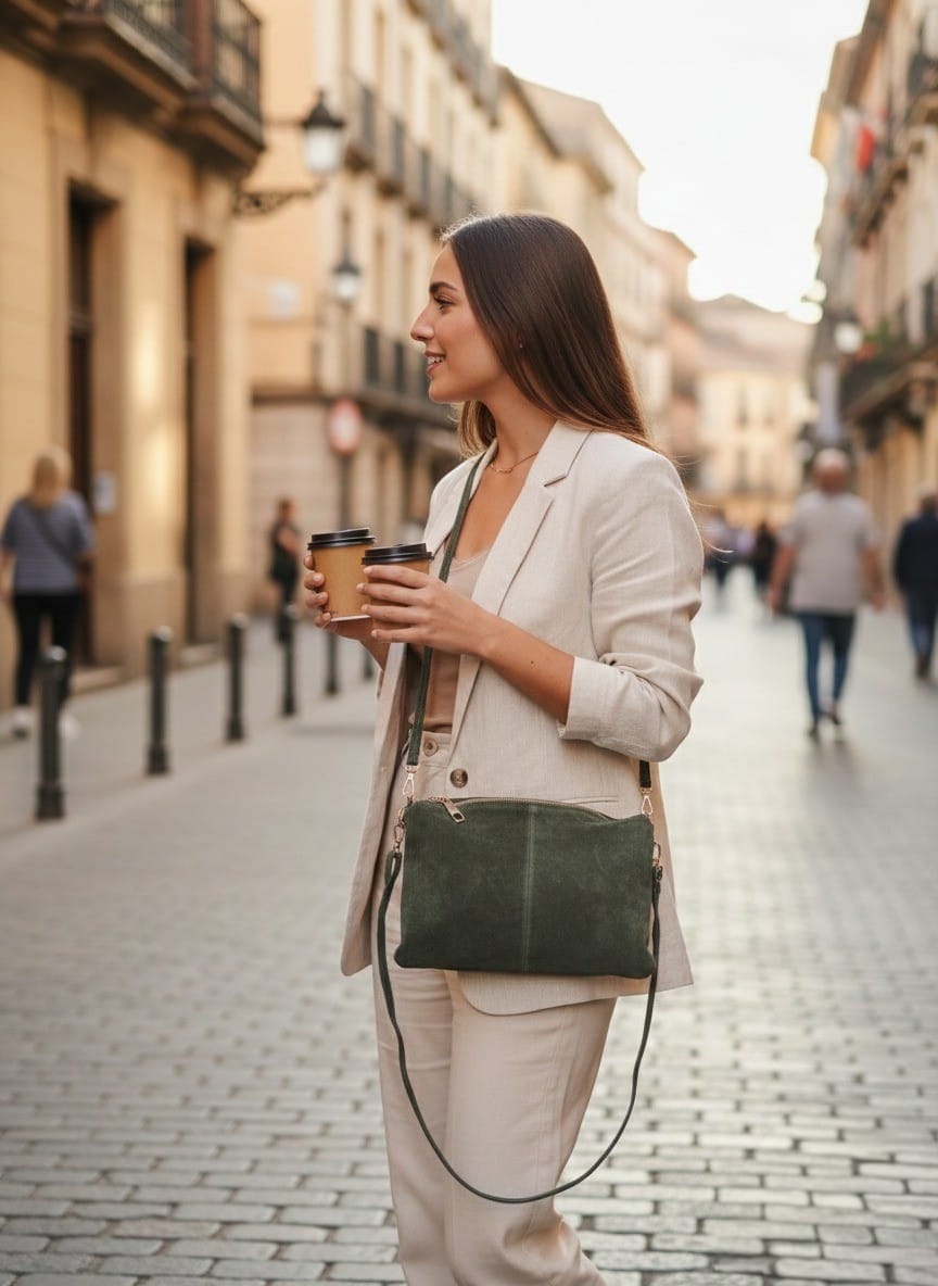 Añade un toque de naturaleza y elegancia relajada a tu armario con nuestro bolso Suede Essential. Este modelo destaca por su exquisito acabado en piel de ante color verde oliva, ofreciendo una textura aterciopelada que es tan agradable al tacto como a la vista. Es el accesorio definitivo para quienes buscan un estilo auténtico y funcional.
